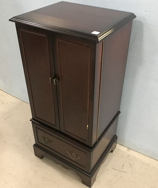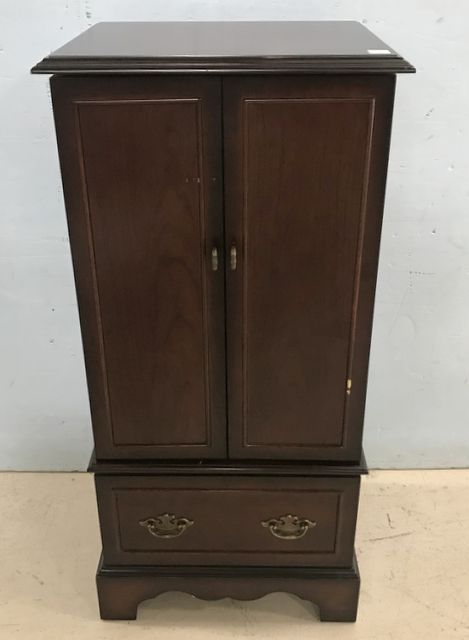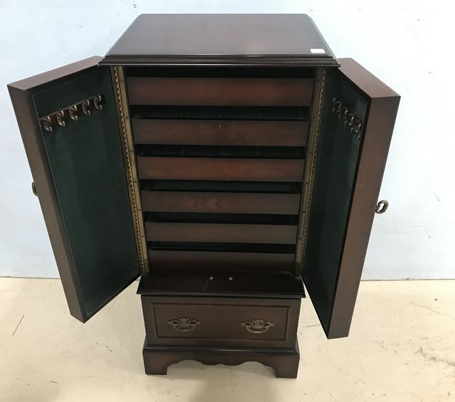 Bombay Company Jewelry Cabinet, cherry, double door, single drawer storage, 38"h., 18"w., 15"d. Bombay Company Jewelry Cabinet, cherry, double door, single drawer storage, 38"h., 18"w., 15"d.
