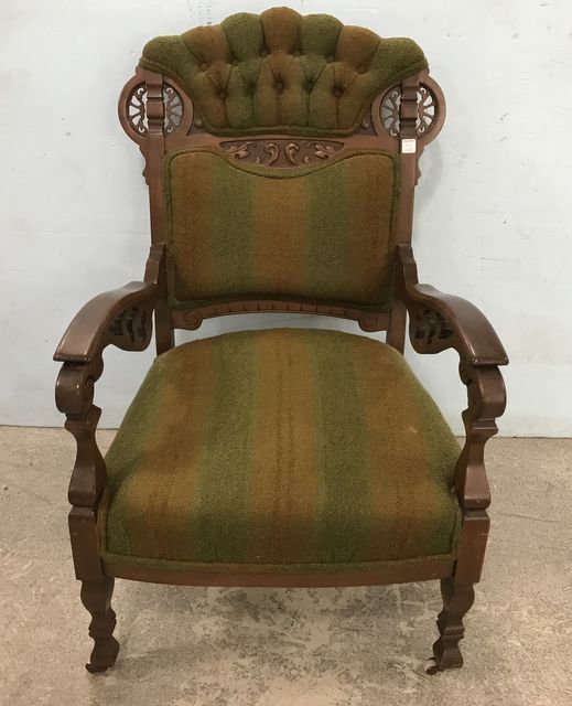 Eastlake Aesthetic Parlor Arm Chair, unique carvings, green fabric, 40"h. Eastlake Aesthetic Parlor Arm Chair, unique carvings, green fabric, 40"h.