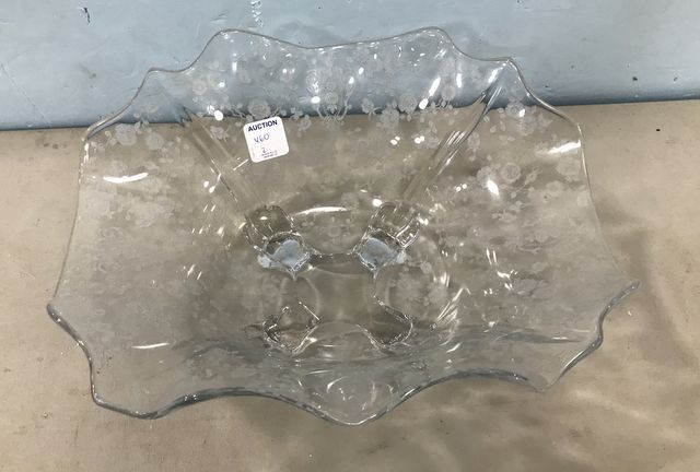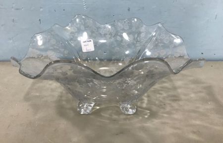 Rose Point Scalloped Bowl, footed, etched glass, 5"h., 12"w. Rose Point Scalloped Bowl, footed, etched glass, 5"h., 12"w.