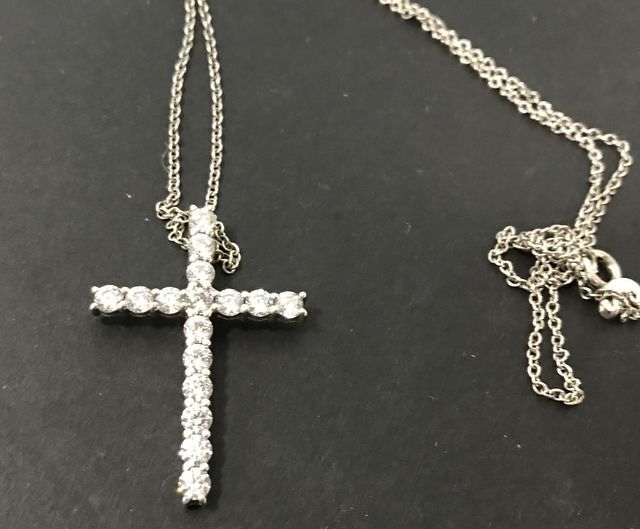 CZ stones, .925 cross pendant and link chain. CZ stones, .925 cross pendant and link chain.