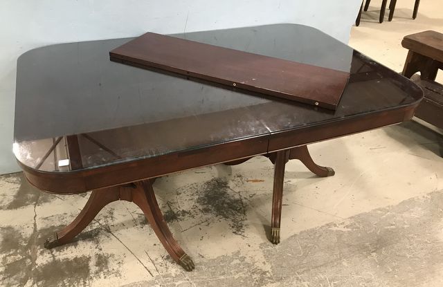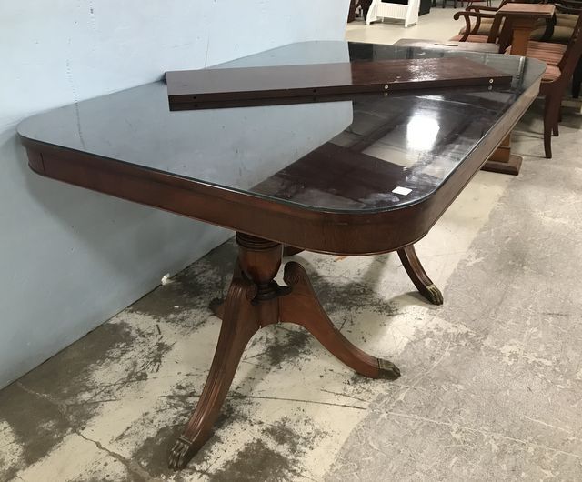 Duncan Phyfe Style Double Pedestal Dinning Table, claw brass cap feet, one leaf, glass top, mahogany, 30"h., 58"L., 38"w. Duncan Phyfe Style Double Pedestal Dinning Table, claw brass cap feet, one leaf, glass top, mahogany, 30"h., 58"L., 38"w.