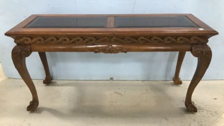 Antique Reproduction Ball-n-Claw Sofa Table, tinted beveled glass panels, 27'h., 53"w., 18"d. Antique Reproduction Ball-n-Claw Sofa Table, tinted beveled glass panels, 27'h., 53"w., 18"d.
