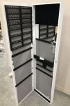 Mirrotek, made in USA, mirror door, hanging hooks, mirror, felt lining, white exterior, 66"h., 18"w. Mirrotek, made in USA, mirror door, hanging hooks, mirror, felt lining, white exterior, 66"h., 18"w.