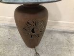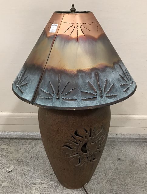 South west style lamp, decorative tin shade with ceramic vase with sun decor lamp, 26"h. South west style lamp, decorative tin shade with ceramic vase with sun decor lamp, 26"h.