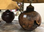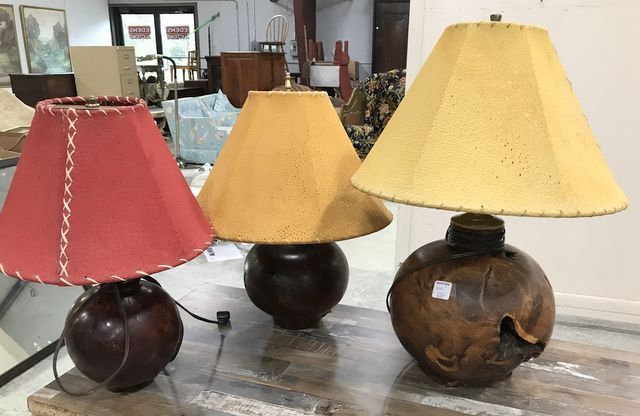 Three carved round wood lamps with shades, natural wood, tallest is 22"h. Three carved round wood lamps with shades, natural wood, tallest is 22"h.