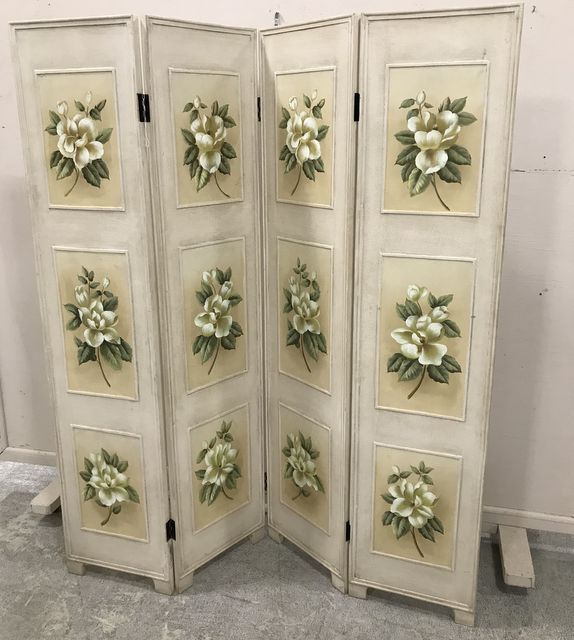 Modern Four Panel Dressing Screen, painted magnolia flowers, fold out screen, 71"h., 16"w., each panel. Modern Four Panel Dressing Screen, painted magnolia flowers, fold out screen, 71"h., 16"w., each panel.