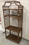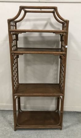 Oriental Style Bamboo Display, three shelves, woven bamboo frame work, has some finish wear, 72"h., 29"w., 16"d. Oriental Style Bamboo Display, three shelves, woven bamboo frame work, has some finish wear, 72"h., 29"w., 16"d.