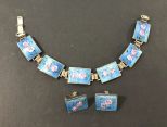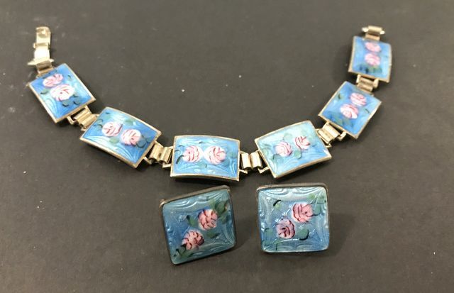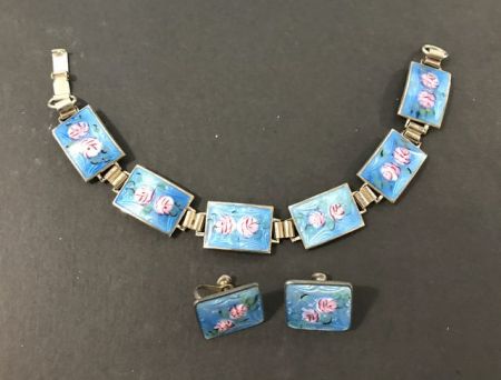 652 Vintage Sterling Enamel Rose Design Bracelet and Earrings