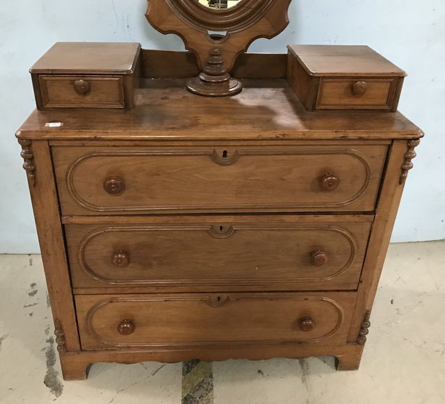Vintage Victorian Style Wish bone mirror and dresser, glass boxes, three drawers, normal age wear, 65"h., 39"w., 18"d. Vintage Victorian Style Wish bone mirror and dresser, glass boxes, three drawers, normal age wear, 65"h., 39"w., 18"d.