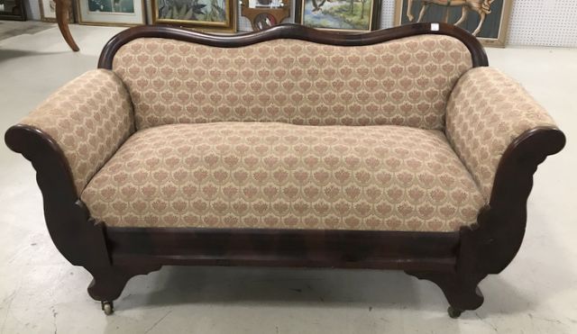Antique Empire Style Settee, veneer, missing some veneer pieces, spring seat, on wheels, 29"h., 56"w. Antique Empire Style Settee, veneer, missing some veneer pieces, spring seat, on wheels, 29"h., 56"w.