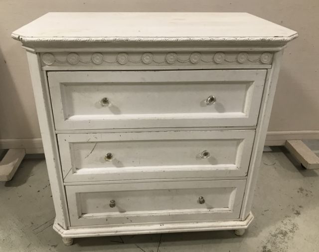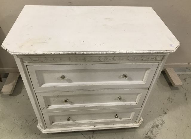 Simply Shabby Chic Chest of Drawers, painted white, clear glass knobs, has wear and scratches, 36"h., 21"d., 36"w. Simply Shabby Chic Chest of Drawers, painted white, clear glass knobs, has wear and scratches, 36"h., 21"d., 36"w.