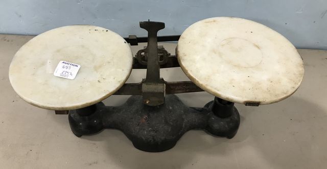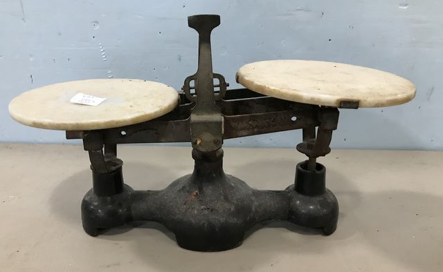Antique Victorian Style Scale, marble stands, iron base, painted black, needs cleaning, good condition, 9"h., 14"w. Antique Victorian Style Scale, marble stands, iron base, painted black, needs cleaning, good condition, 9"h., 14"w.