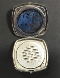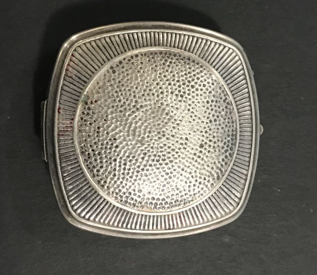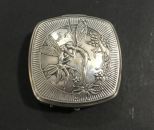Art Nouveau Silver Plate Powder, Djer Kiss, made in 1925, fairy figures, 2" x 2". Art Nouveau Silver Plate Powder, Djer Kiss, made in 1925, fairy figures, 2" x 2".