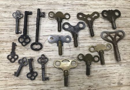 Group of vintage keys, clock keys (9), vintage furniture keys (7). Group of vintage keys, clock keys (9), vintage furniture keys (7).
