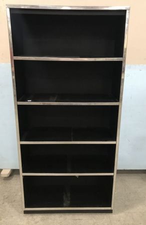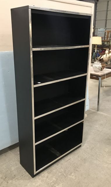 Black painted bookcase with chrome style trim work, four shelf, pressed board, 68"h., 38"w., 12"d. Black painted bookcase with chrome style trim work, four shelf, pressed board, 68"h., 38"w., 12"d.