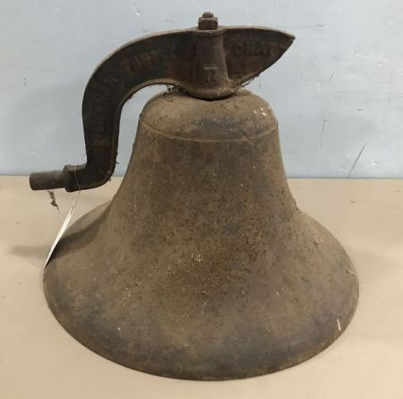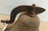 Ross Meehan FDRY Co. Dinner Bell, broken arm, has wear, missing clapper, 16". Ross Meehan FDRY Co. Dinner Bell, broken arm, has wear, missing clapper, 16".