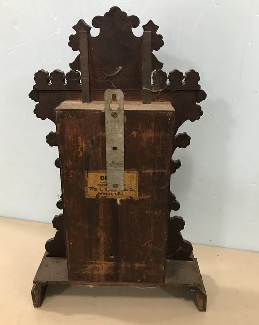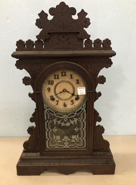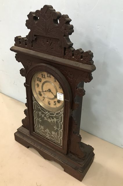 Eastlake Style Mantel Clock, DELOS, Wm. L. Gilbert Clock Co., Winsted, Conn. Ornate carved wood frame, has pendulum, and key. Age wear on finish, added hanging bracelet on back, also manufacturer tag on back, untested, 23"h., 14"w. Eastlake Style Mantel Clock, DELOS, Wm. L. Gilbert Clock Co., Winsted, Conn. Ornate carved wood frame, has pendulum, and key. Age wear on finish, added hanging bracelet on back, also manufacturer tag on back, untested, 23"h., 14"w.