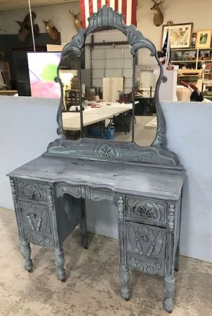 1930's-40's Depression Era Painted Vanity, blue, distressed, with mirror, 69"h., 42"w., 14"d. 1930's-40's Depression Era Painted Vanity, blue, distressed, with mirror, 69"h., 42"w., 14"d.