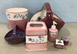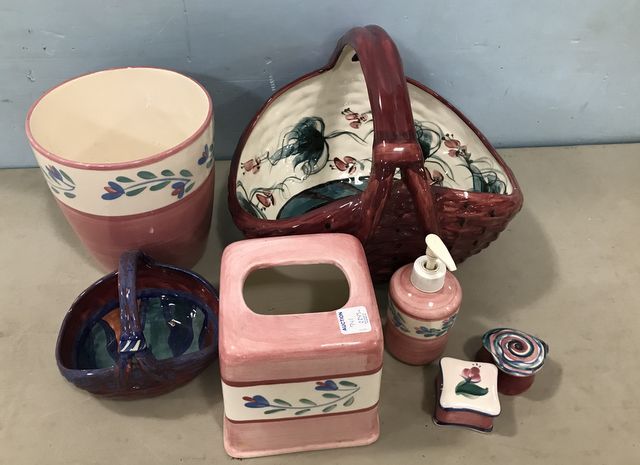 Large hand painted Gail Pittman basket, kleenex cover, vase (small chips on rim), small basket, soap dispenser, trinket boxes. Large hand painted Gail Pittman basket, kleenex cover, vase (small chips on rim), small basket, soap dispenser, trinket boxes.