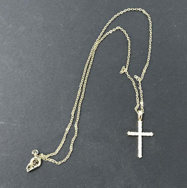 14 k Plated Cross Necklace, link chain, clear stone insets. 14 k Plated Cross Necklace, link chain, clear stone insets.