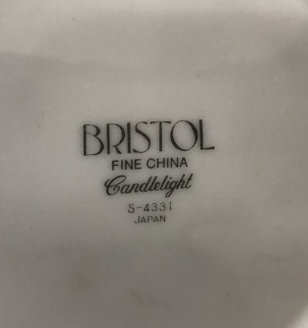 Bristol "Candlelight" Fine China Set, 8 dinner plates, 8 salad bowls, serving bowl, 8 saucers, 6 cups, 8 dessert plates, platter, sugar & creamer, some small chips. Bristol "Candlelight" Fine China Set, 8 dinner plates, 8 salad bowls, serving bowl, 8 saucers, 6 cups, 8 dessert plates, platter, sugar & creamer, some small chips.