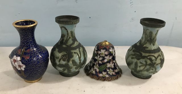 Cloisonne miniature vases 3"h., and bell. Cloisonne miniature vases 3"h., and bell.