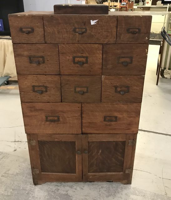 Vintage file drawer index card organizer, double door base, oak, needs some work, 50"h., 31"w., 17"d. Vintage file drawer index card organizer, double door base, oak, needs some work, 50"h., 31"w., 17"d.