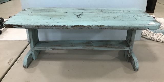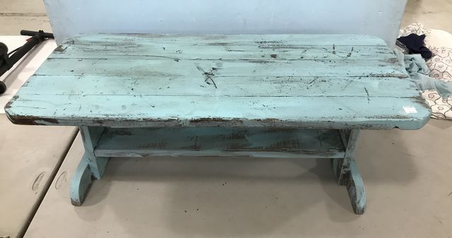 Hand Made Painted Coffee Table, primitive style, home made, needs tightening, 15"h., 40"w., 18"d. Hand Made Painted Coffee Table, primitive style, home made, needs tightening, 15"h., 40"w., 18"d.