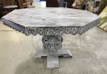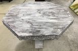 Polygon White Painted Pedestal Table, carved border trim work, needs some work, veneer spot missing on top, 30"h., 50"w. Polygon White Painted Pedestal Table, carved border trim work, needs some work, veneer spot missing on top, 30"h., 50"w.