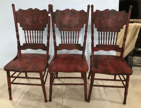 Three painted red pressed back chairs, 43"h. Three painted red pressed back chairs, 43"h.