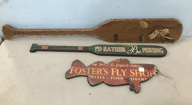 Boat paddle hat rack, two hook are broken, 41"L., I'D rather be fishing paddle, and Foster's Fly Shop sign. Boat paddle hat rack, two hook are broken, 41"L., I'D rather be fishing paddle, and Foster's Fly Shop sign.