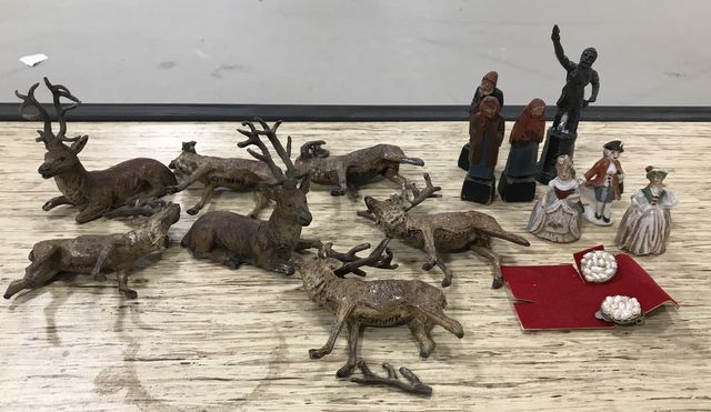 German metal painted red stag figurine (all have damage), wood carved figurines, metal mini statue, three small porcelain figurines. German metal painted red stag figurine (all have damage), wood carved figurines, metal mini statue, three small porcelain figurines.