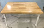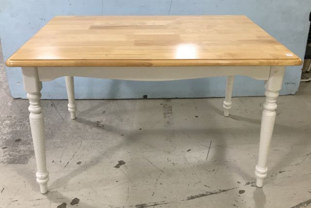 Modern Pine and Painted White Kitchen Table , pine top with painted white base, legs are bolt on, minor wear, 29"h., 48"w., 30"d. Modern Pine and Painted White Kitchen Table , pine top with painted white base, legs are bolt on, minor wear, 29"h., 48"w., 30"d.