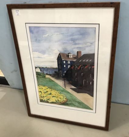 Watercolor "Town Street View" by Anita Whitley, matted, framed, 28"h., 21"w. Watercolor "Town Street View" by Anita Whitley, matted, framed, 28"h., 21"w.