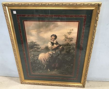 Large Gold Gilt Decorative Girl with Sheep, gold gilt frame, matted, glassed, 39"h., 33"w. Large Gold Gilt Decorative Girl with Sheep, gold gilt frame, matted, glassed, 39"h., 33"w.