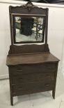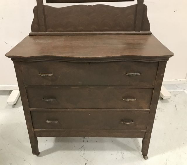 Vintage Three Drawer Dresser, on wheel, back beveled mirror, painted, needs some work, 75"h., 38"w., 19"d. Vintage Three Drawer Dresser, on wheel, back beveled mirror, painted, needs some work, 75"h., 38"w., 19"d.