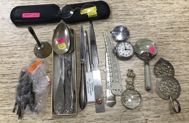 Vintage magnify glasses, vintage sunglasses, pocket watches, letter openers, silver plate serving spoons, group of antique square nails, mini bell. Vintage magnify glasses, vintage sunglasses, pocket watches, letter openers, silver plate serving spoons, group of antique square nails, mini bell.