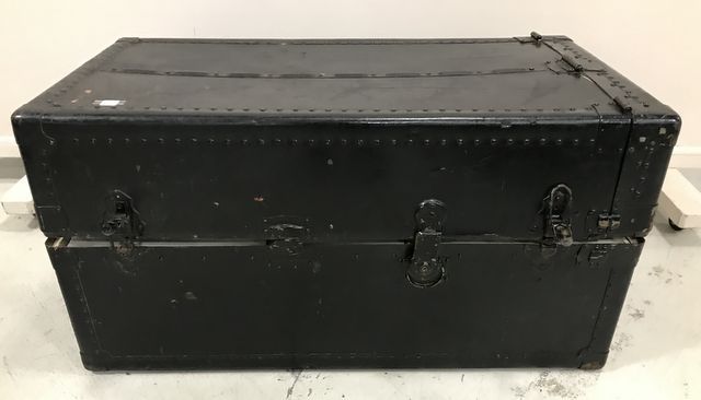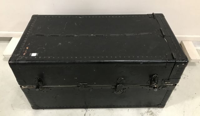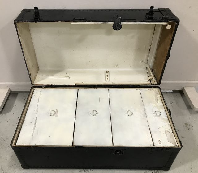 Black Painted Streamer Luggage Trunk, painted white inside, inner drawers, 20"h., 40"w., 21"d. Black Painted Streamer Luggage Trunk, painted white inside, inner drawers, 20"h., 40"w., 21"d.