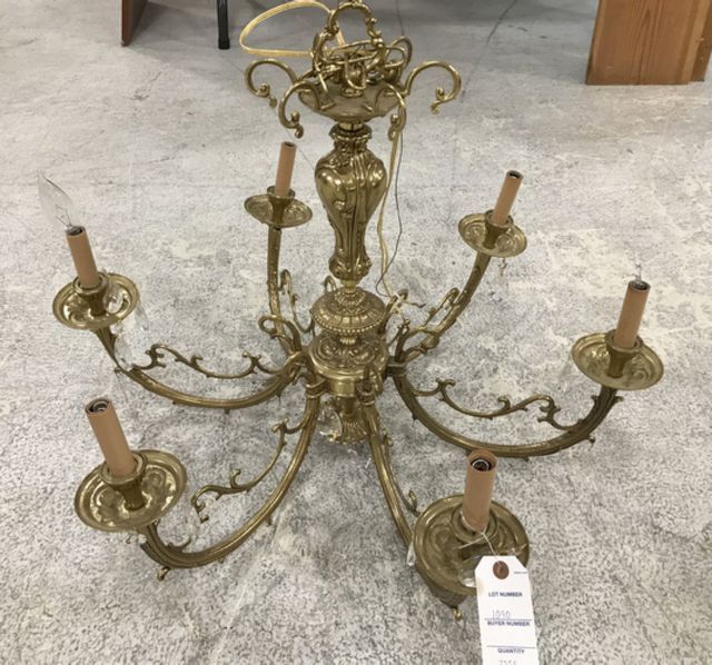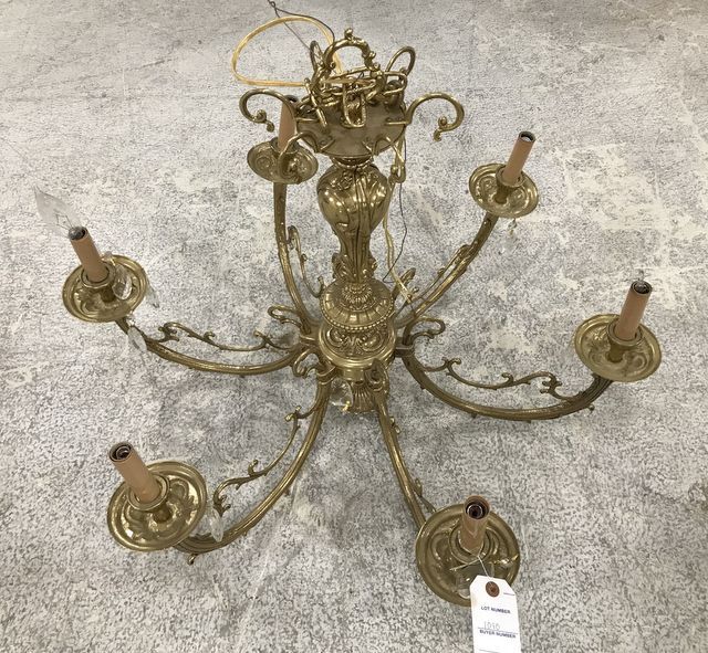 Large Ornate Brass Six Arm Chandelier, missing prisms, over all good condition, 22"h., 29"w. Large Ornate Brass Six Arm Chandelier, missing prisms, over all good condition, 22"h., 29"w.