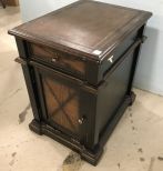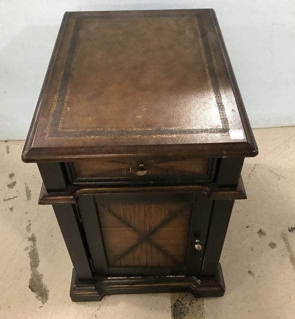Modern Black Painted Nightstand, faux leather top, single drawer, single door, 25"h., 18"w. 32"d. Modern Black Painted Nightstand, faux leather top, single drawer, single door, 25"h., 18"w. 32"d.