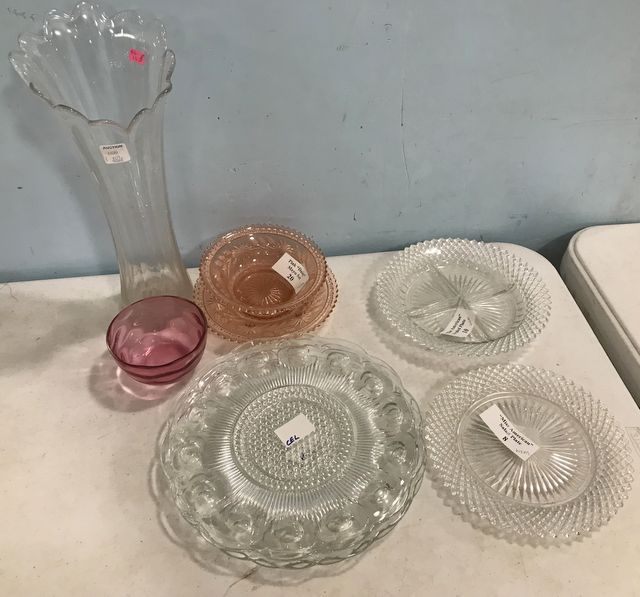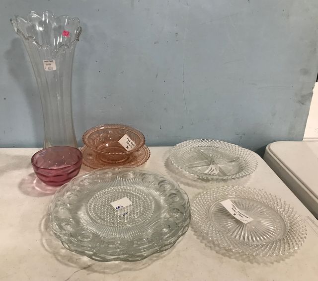 Clear glass flower vase 14"h., Pink "Daisy" Mayo Set, "Miss American" Salad plate and divided plate, three glass platters, cranberry bowl. Clear glass flower vase 14"h., Pink "Daisy" Mayo Set, "Miss American" Salad plate and divided plate, three glass platters, cranberry bowl.
