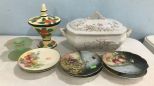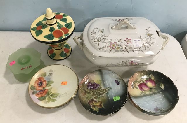 Transferware covered vegetable (no ladle), 7 hand painted plates, frost glass candle holder, Czech art decor candy jar. Transferware covered vegetable (no ladle), 7 hand painted plates, frost glass candle holder, Czech art decor candy jar.