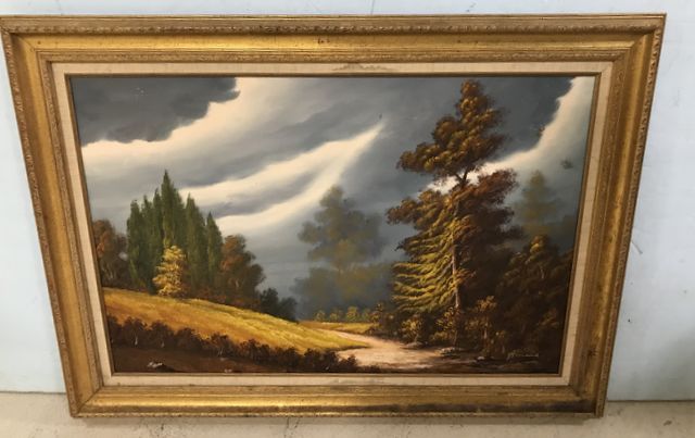 Landscape oil painting on canvas, signed, gold gilt modern frame, 31"h., 44"w. Landscape oil painting on canvas, signed, gold gilt modern frame, 31"h., 44"w.