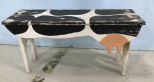 Wood Diary cow style painted bench, age wear on painted, milking bench, 18"h., 36"w. Wood Diary cow style painted bench, age wear on painted, milking bench, 18"h., 36"w.