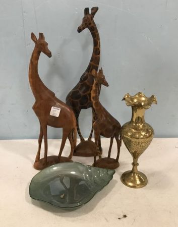 Three Giraffe wood statues, one has repair neck, 18"h., decorative glass shell dish, and Etched design brass vase. Three Giraffe wood statues, one has repair neck, 18"h., decorative glass shell dish, and Etched design brass vase.