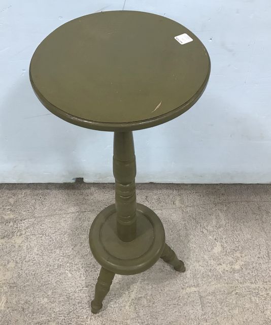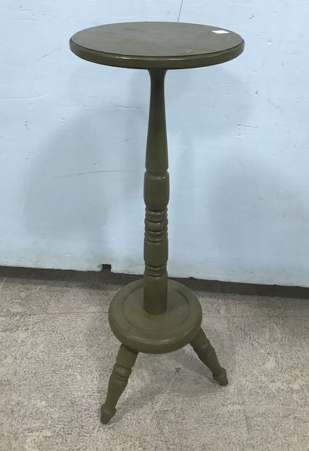 Painted green skinny round top pedestal stand, 34"h., 12"dia. Painted green skinny round top pedestal stand, 34"h., 12"dia.