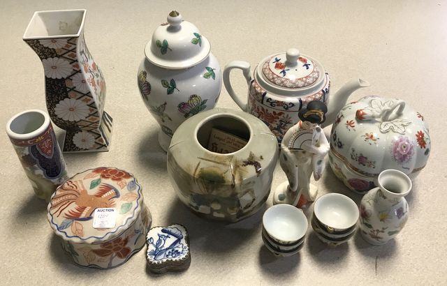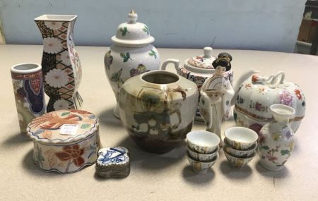 Japanese vases, figurine, cups, mini vase, teapot, small urn, pottery vase, porcelain pill box, covered dish with cracked lid. Japanese vases, figurine, cups, mini vase, teapot, small urn, pottery vase, porcelain pill box, covered dish with cracked lid.