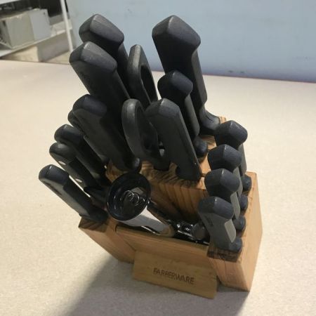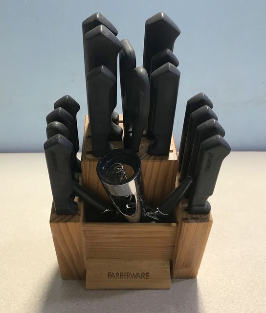 Farberware knife kit, scissors, knives, wine opener, with wood stand. Farberware knife kit, scissors, knives, wine opener, with wood stand.
