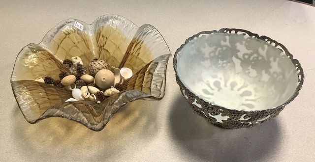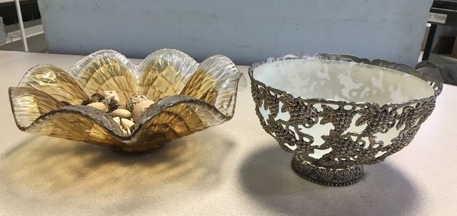 1208 Art Glass Center Piece Bowl and Meta Fruit Bowl