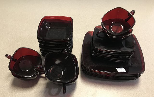 Ruby Red Dinner Ware Partial Set, 7 cups, 8 bowls, 8 saucers, 8 salad plates. Ruby Red Dinner Ware Partial Set, 7 cups, 8 bowls, 8 saucers, 8 salad plates.